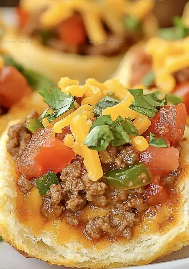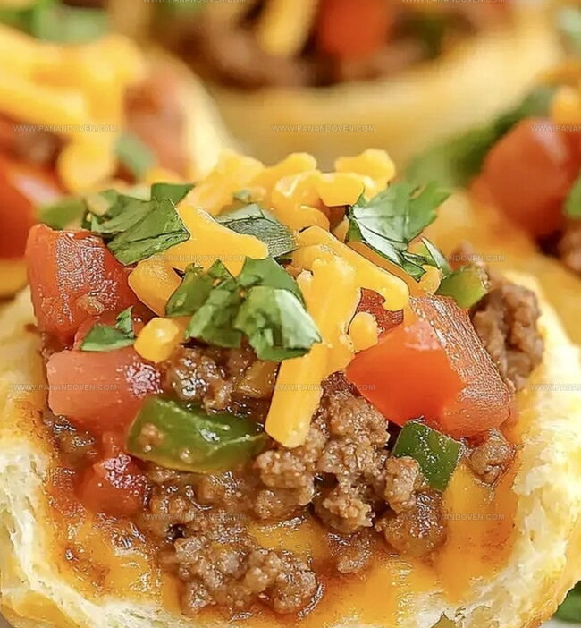 The golden, flaky cups cradle seasoned ground beef and melted cheese in a handheld delight.