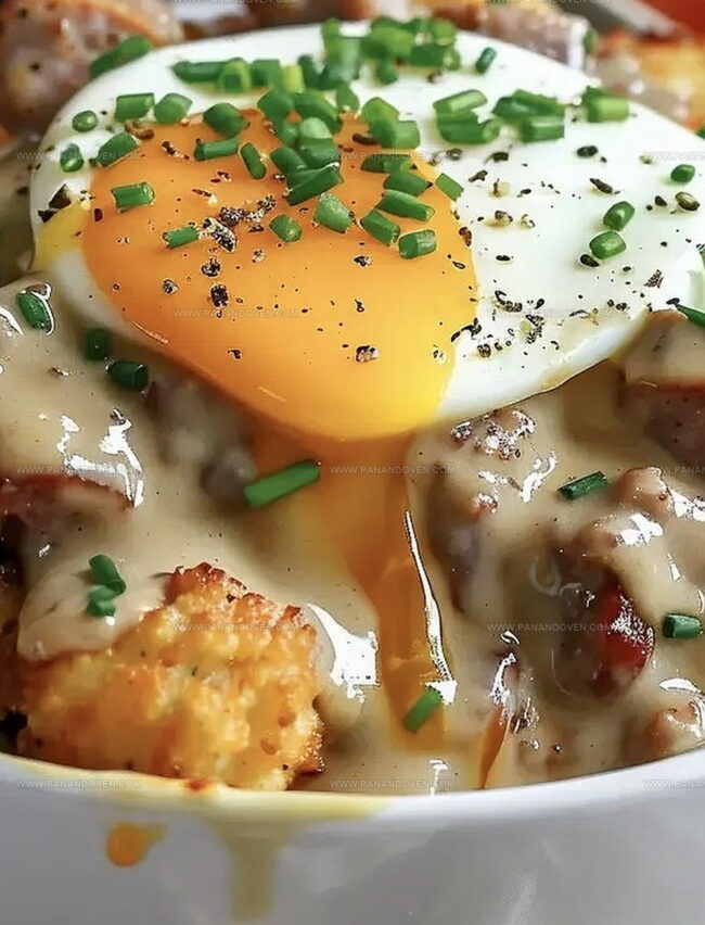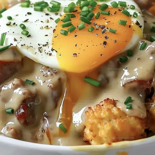 Hearty Tater Tot Breakfast Bowl with sausage gravy combines crispy potatoes, savory sausage, and creamy sauce in one satisfying morning meal. Breakfast enthusiasts will savor this comforting dish that delivers bold flavors and filling goodness.