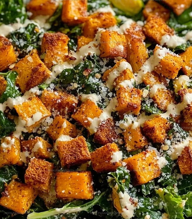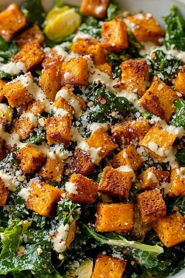- Compose the salad by generously coating the massaged greens with caesar dressing. Artfully arrange roasted squash cubes, sprinkle freshly grated parmesan, and crown with crushed croutons for a delightful winter Caesar experience.